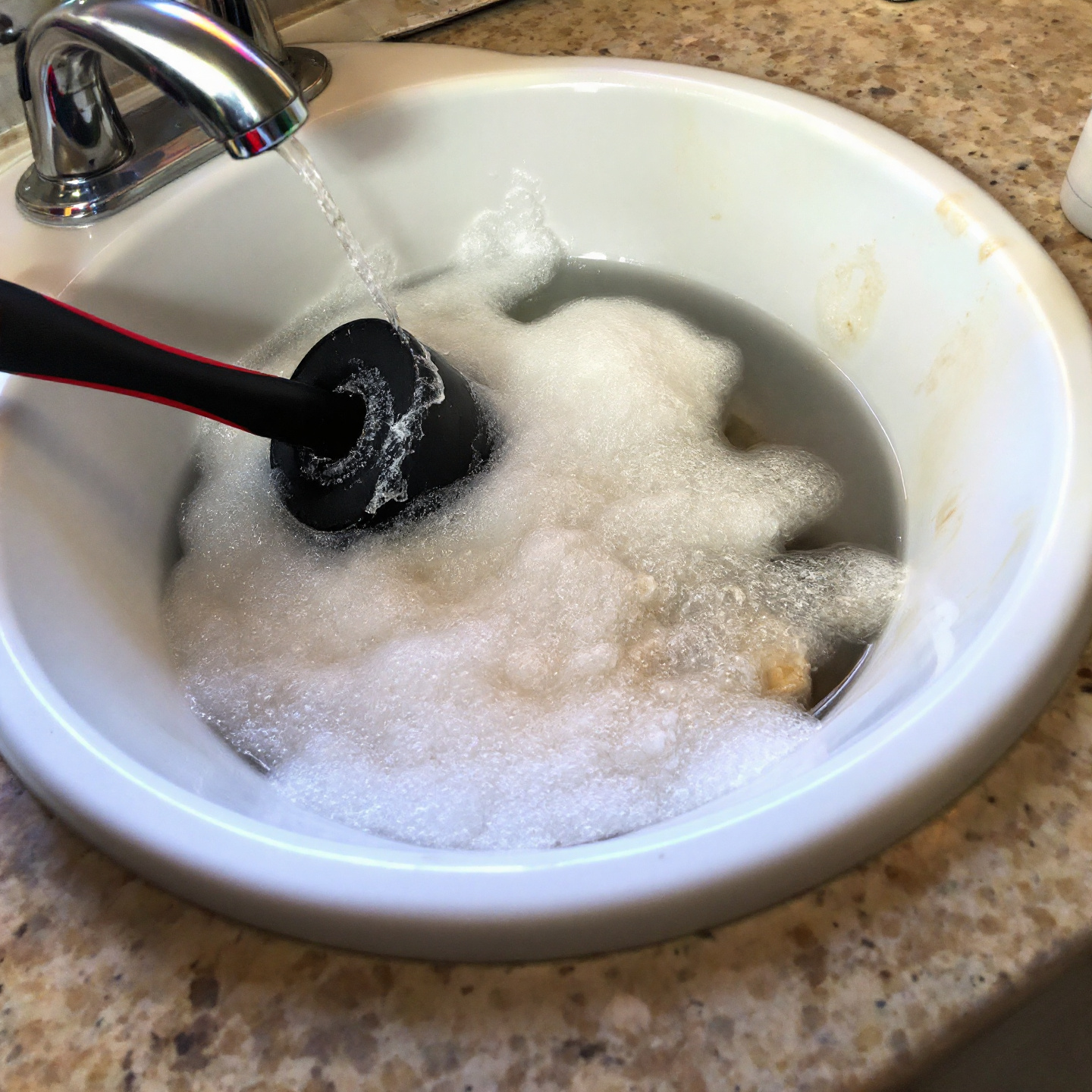 - 플런저의 고무 부분을 완전히 배수구에 대고, 단단히 고정한다 - 이 단계는 기포가 없도록 하는 데 매우 중요합니다.