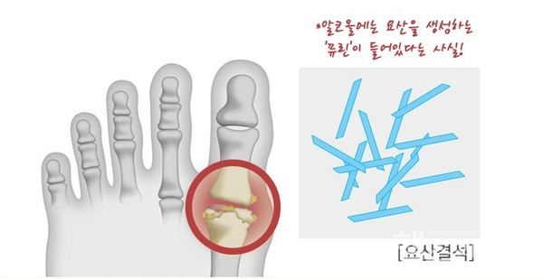 - 특징: 체내 요산이 축적되어 관절에 염증이 생기는 질환.