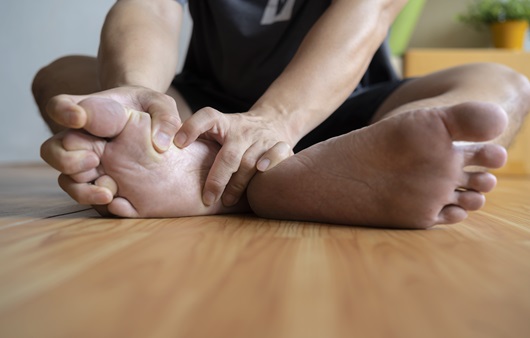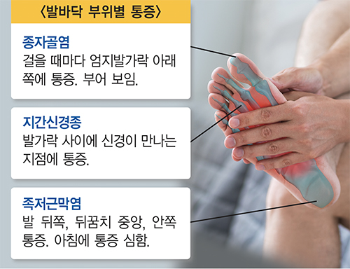 - 증상: 발바닥과 엄지발가락 아래의 날카로운 통증, 아침에 심해짐.