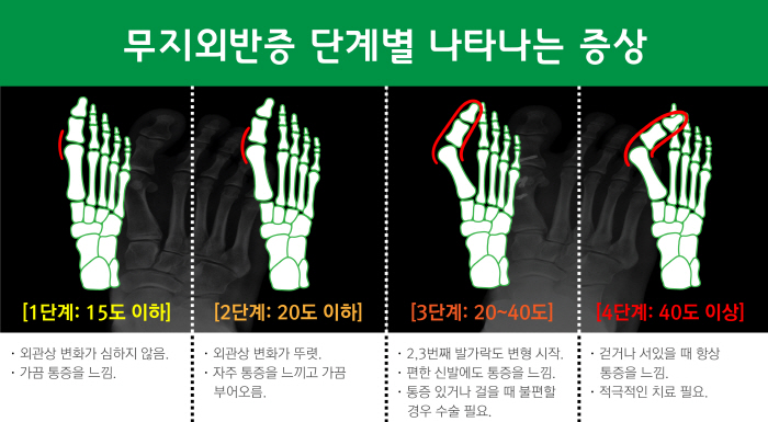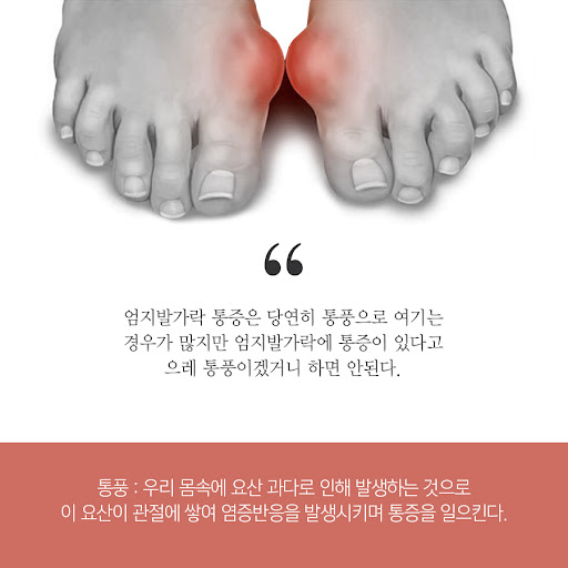 - 증상: 발가락 관절의 통증, 발등의 부기, 신발 착용 시 심한 불편감.