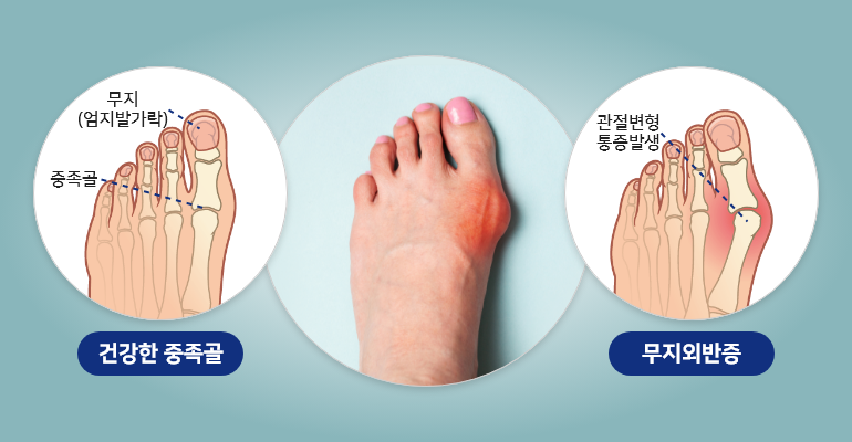 - 특징: 엄지발가락이 옆으로 휘면서 발볼 부위가 돌출되는 상태.